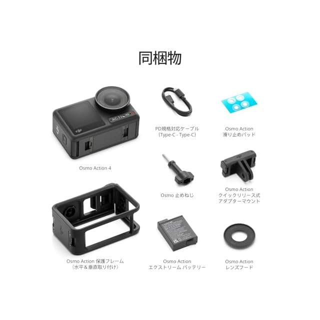 ✅同梱物:Osmo Action 4×1,Osmo 止めねじ×1,Osmo Action 滑り止めパッド×1,Osmo Action レンズフード×1,PD規格対応ケーブル(Type-C - Type-C)×1,Osmo Action 保護フレーム(水平&垂直取り付け)×1,Osmo Action エクストリーム バッテリー×1,Osmo Action クイックリリース式アダプターマウント×1