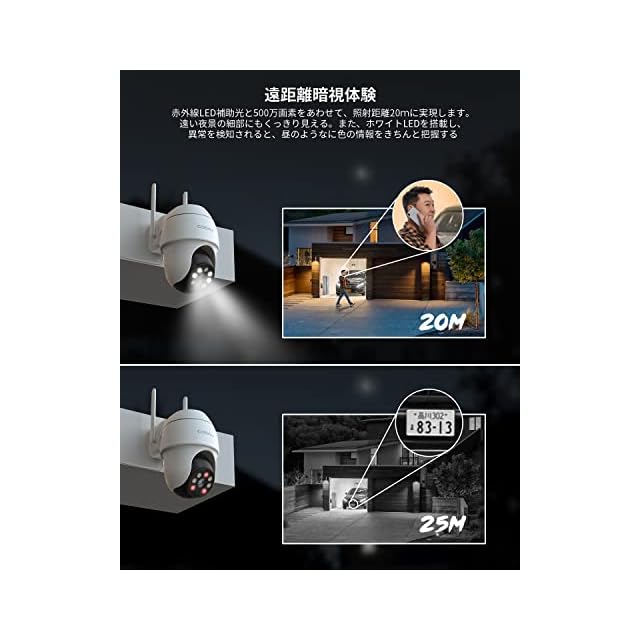 【遠距離暗視&双方向通話&自動威嚇】夜は常に遠い視覚を障害されて、不安を感じするが、夜間は自動的に赤外線モードに切り替わって4つ赤外線LEDを25Mまで照射して、周囲の動きをはっきり確認できます。更にチェックできるし、会話できる。穏やかで安心な夜に家族とテレビを見たり、一人で本を楽しんたりすることができる。まだ、周囲異常を検知すると自動に可聴警報/発光警報/声光警報3つのアラームで,寝ている間に不審者を追い払うと同時にカラーある証拠を保存される。起きたら、服色や車の色などの細部情報をきちんと確認できる。一人でもぐっすりねむる。