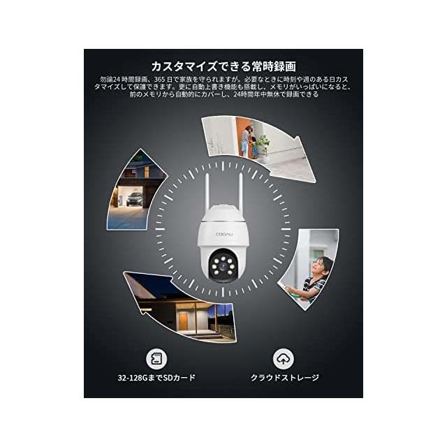 商品名:【500万高画素 ・遠距離も超精細】COOAU 防犯カメラ 屋外 ワイヤレス/wifi 5MP/1944P 遠距離暗視 5dBiアンテナ H.265動画圧縮 夜間カラー撮影 監視カメラ パン/チルト 360°広角撮影 常時録画 人体検知 検出エリア設定 発光威嚇 可復元自動追跡 双方向音声 家族共有 IP66防水 遠隔操作 警報通知 玄関/店/自宅見守りカメラ Ptz メモリカード/クラウド保存