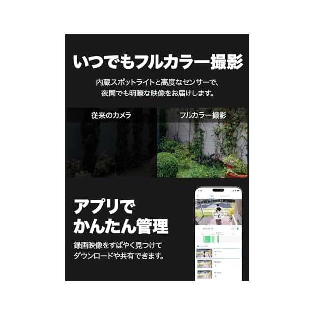 【いつでもフルカラー撮影】大口径レンズ&スポットライト搭載のカメラが、夜間や薄暗い場所でも最大9m先までハッキリと映し出します。