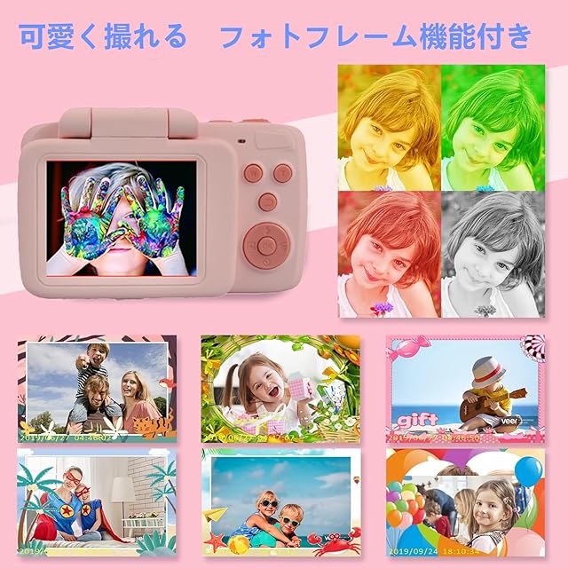 【レンズ180°反転可能&素晴らしいキッズカメラ】 写真や録画のほか、レンズを180°反転するだけで自撮りを実現することができます。子供用カメラ にはタイマー撮影、32種類の写真フレーム、MP3音楽、5種類のゲーム、遅延録画、スローモーション録画、4倍ズームなど多彩な機能が含まれており、子供の好奇心を広げ、成長をサポートします。日付ラベルの追加もでき、大事な日を忘れずに記録しておきましょう。