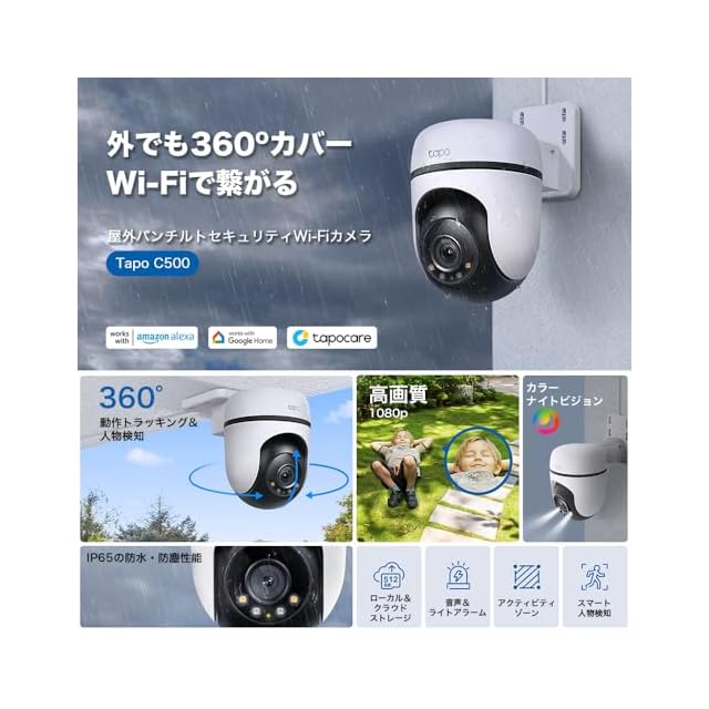 TP-Link WiFi ネットワークカメラ みまもりカメラ 屋外カメラ 防犯カメラ パン/チルト対応 スマホ アプリ 1080p FullHD IP65 防水 防塵 音声通話 メーカー1年 Tapo C500