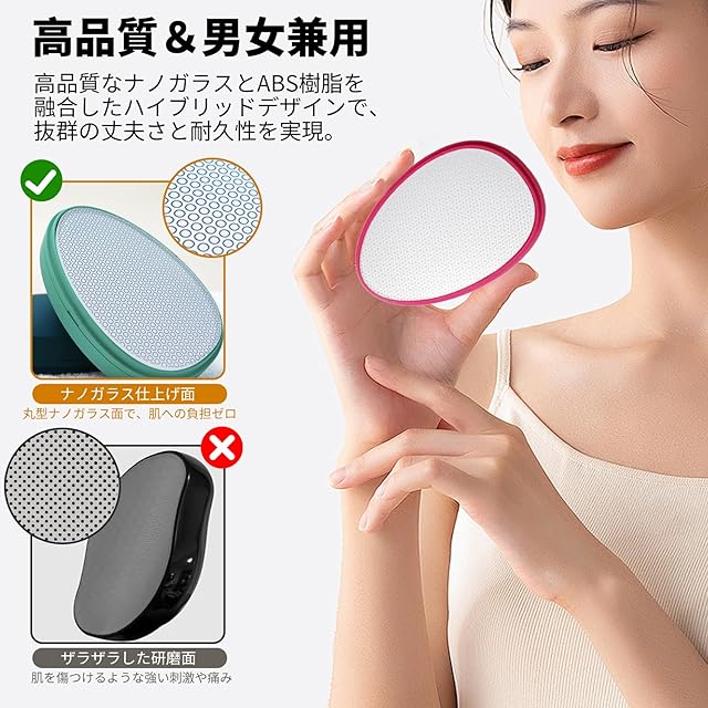 "本製品は先進のナノガラス技術を採用し、刃物や化学薬品を一切使用せずにムダ毛をやさしく除去。肌への負担を最小限に抑え、敏感肌の方にも安心してお使いいただけます。使い方はとても簡単。肌に軽く当て、円を描くように優しくこするだけで、ムダ毛だけでなく古い角質もすばやく除去。まるでエステでケアしたような、つるんとなめらかな素肌へと導きます。</BR> 独自のナノ粒子構造により、ムダ毛や古い角質をやさしく取り除きながら、肌表面をなめらかに整えます。脱毛と角質ケアを同時に行うことで、肌本来の美しさを引き出し、まるで生まれ変わったかのような、つるんと洗練された肌へ導きます。</BR> 重さはたったの78グラム。ポケットや化粧ポーチにもすっきり収まり、持ち運びにも便利です。ご自宅はもちろん、旅行先やジム、急なデートの前など、いつでもどこでも手軽に使用でき、清潔でなめらかな肌をキープできます。</BR> 電池や電源コードは一切不要。肌に優しく円を描くように擦るだけで簡単に脱毛が可能です。使用後は水で洗い流すだけの簡単お手入れ。男女問わず全身のさまざまな部位に使えて、ご家族みんなで安心してお使いいただけます。</BR> この使いやすい製品は、毎日のケアや季節ごとの肌のリフレッシュに最適です。また、スパトリートメントや入浴と組み合わせることで、より効果的で包括的なトリートメントが実現します。</BR> ブラック、ローズレッド、アボカドグリーン、ホワイトの4色展開。多彩なカラーバリエーションで、さまざまなスタイルや好みに対応します。カップルやご家族での共有にもぴったりです。</BR>"