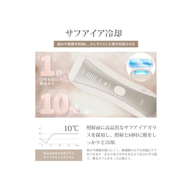 【サファイア冷却&無痛脱毛】サファイア冷却機能を搭載し、自宅でも無痛にムダ毛ケアができます。照射面と冷却面を一体化したデザインのため、効率的に冷却と照射を同時に行うことができます。照射ヘッドが肌に密着すると、肌表面温度を最低10℃まで冷やすことができ、肌への負担を軽減しながら無痛で快適な脱毛体験を実現します。