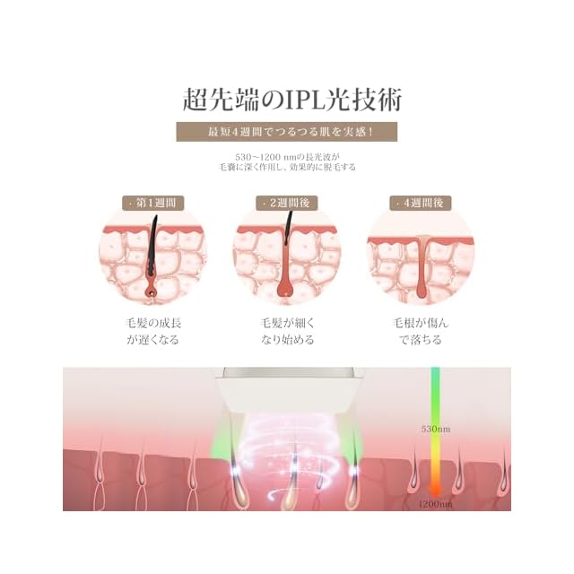 【サロン級IPL光脱毛器】Yete新型脱毛器は、新世代の波長530-1200nmのIPL光技術を採用し、最大24Jの高エネルギー出力で毛根に深く作用し、効果的に脱毛を行います。使い続けるほど肌がなめらかに変わるのを実感できます。