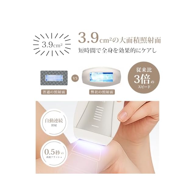 【無限照射回数&広範囲照射】回数無制限で照射できる光脱毛器なので、長く使えて寿命の心配もなく、家族全員の使用シーンや長期の脱毛に対応します。1台で家族と共用できる家庭用脱毛器です!3.9 cm²の大面積照射ヘッドは広範囲に照射することができ、短時間で全身を効果的にケアし、速く脱毛を実現することができる。