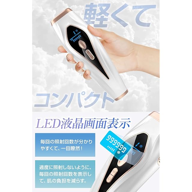 【99万回照射回数・カートリッジ交換不要】99万回照射回数があり、毛深い方も満足できるまでたっぷり照射できる脱毛器 です。1人での使用なら約30年分に相当する照射回数があり、頻繁な買い替えやカートリッジ交換の必要がなく、経済的です。毛深い方や複数人での使用でも十分な照射回数を確保しており、長く使い続けられるのが魅力です。最初に本体を購入するだけでランニングコストがほとんどかからず、サロンやカミソリに頼らないセルフケアを実現。コストパフォーマンスを重視する方に最適な 脱毛器 です。