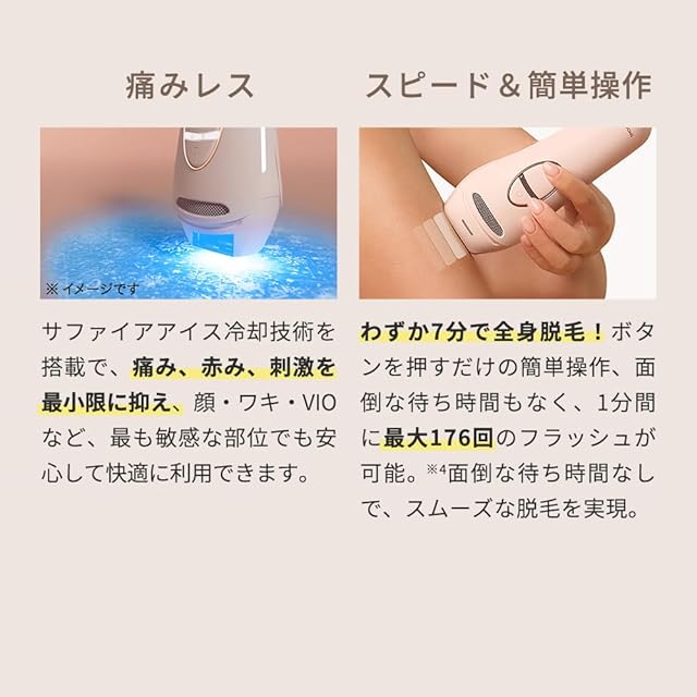 【冷却機能搭載】サファイアアイス冷却技術「アイスモード」搭載。痛くない※脱毛ケア。痛みの感じ方には個人差があり、「痛くない」をするものではありません。