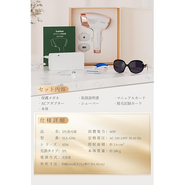 「家庭用IPL光脱毛器で、サロン級の美容体験をご提供します」Sarlisi脱毛器は肌にやさしい先端の美容技術を採用しています。IPL光は毛包を狙い、照射することで温熱効果を与えます。定期的な照射により、ムダ毛の発育を阻害し除毛効果を得ることができます。継続的な使用により、約8週間後にはお肌が滑らかになり、ムダ毛が目立ちにくくなる効果を実感できます。