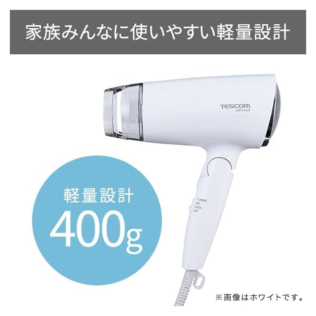 重さわずか400g。従来機種(TID190 /TID295 )よりもコンパクトに軽量化し、更に疲れにくく、扱いやすいドライヤーに。ご年配のかたからお子さままで、ファミリーユースにぴったりなドライヤーです。