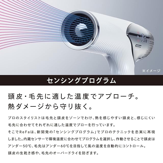 【頭皮と毛先を熱ダメージから守り美しく乾かすセンシングプログラム】ReFa BEAUTECH DRYER SMARTは内蔵センサーが環境温度を感知してそれに合わせたプログラムを選択し、作動させます。このプログラムによって温風と冷風を自動で切り替え、また温風温度自体も微調整。オーバードライを防ぎ、頭皮のため、毛先のための、適した温度を生み出し、正しいドライテクニックへと導きます。