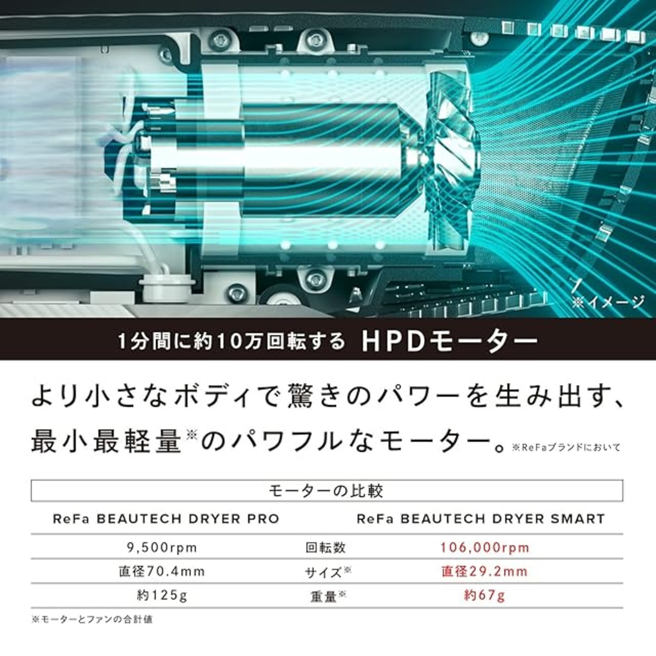 【最小最軽量※のパワフルなモーター】世界的モーターメーカーNidecと共同開発したヘアドライヤーのための最小最軽量※でパワフルな「HPDモーター」を搭載。 ※ ReFaブランドにおいて