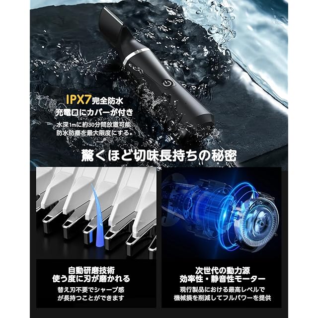 【切れ味を長持ち・IPX7防水】航空宇宙材料のコーティングを塗布したボディシェーバーは、刃の耐久性と切れ味を両立しています。自動研磨機能により、刃を交換しなくても常にシャープな剃り味が持続。替刃代が高いカミソリの代替品を探す方に推薦!IPX7基準をクリアした防水設計と、構造刃を外さずに毛クズと皮脂を洗い流せる「目詰まりづらい」ボディ構造で、都度しっかり汚れを取り除きましょう。お手入れ簡単というニーズを深掘りし、洗練された2025全新メンズシェーバー!