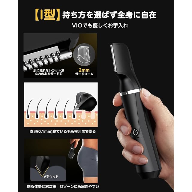 【プロ級VIOケア・持ちやすいI字刃】ユニックなI形こそ、剃り姿勢は自由にチェンジ。V形刃先は皮膚とちょうど良い30°の角度をつけ、寝ている体毛をしっかり逆立てると剃りやすくなります。手のお届けにくいお尻毛、陰毛などデリケートゾーンをキャッチし、VIOシェーバーとして剃り残しやすい曲線や狭い箇所にご活用いただけます。専用の2mmコームがついていれば、毛を根元まで剃りすぎないことで、毛先のチクチク感を抑え、自然な印象を与えられます。