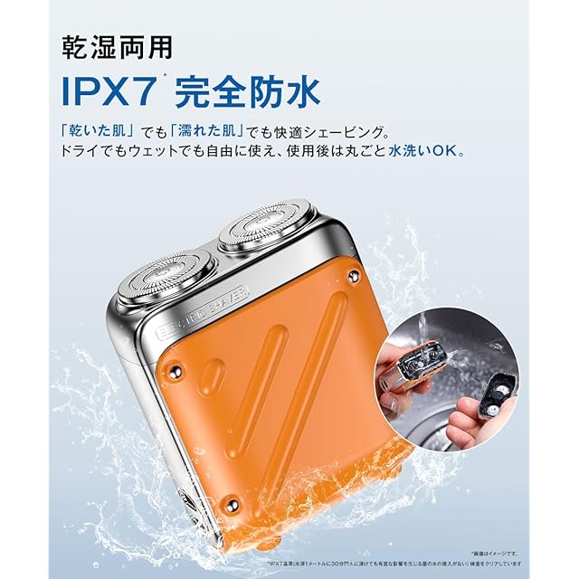 【IPX7完全防水 & 丸洗いOK】 IPX7防水仕様で、シェーバー 本体を丸ごと水洗い可能。ドライ剃りだけでなく、シェービングフォームやジェルを使った ウェット剃り にも対応し、肌への負担を軽減。乾湿両用 設計により、敏感肌の方でも安心して使用できます。使用後はサッと洗い流せるので、ひげそり 後も常に清潔な状態をキープできます。