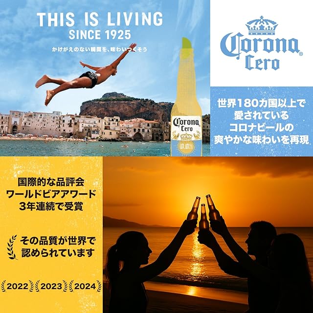 国際的な品評会である「ワールド・ビア・アワード」で2度金賞を受賞をした確かな味わい。 脱アルコール製法でコロナビールの爽快感をそのままに一日のどの時間でも楽しんでいただくことができます。 外観は鮮やかなレモン・ゴールド色。香りは麦芽とホップがバランス良く調和。飲み口は軽やかなボディですっきり。
