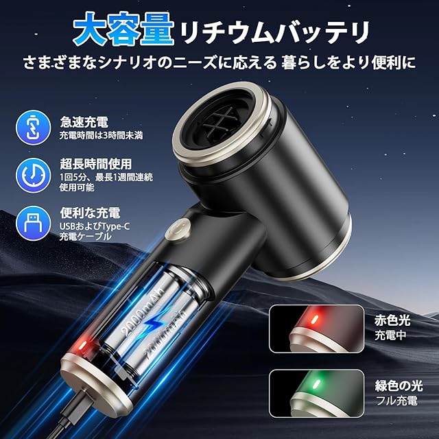 【大容量・USB充電】掃除機 ハンディ大容量バッテリーを内蔵し、長時間の使用が可能。充電時間は2.5時間、使用時間は20分です。充電中は充電ヘッド側面のインジケーターランプが赤く点灯します。充電が完了すると、インジケーターランプが赤から緑に変わります。電源が切れても、充電ヘッドはコンピューター、カーチャージャー、アダプター、モバイル電源で便利に充電できます。