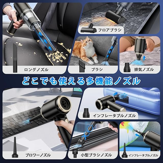 【多機能4-in-1車用 ハンディクリーナー コードレス】✅吹き飛ぶ✅ 吸い込む ✅空気入れ ✅空気抜き 交換可能なノズルが付属しています。コンパクトで軽量なので、車内に置いてもホコリやゴミを効果的に掃除できます。また、屋外での使用にも適しており、浮き輪や風船、エアマットレスへの充填にも使用できます。ご家庭では、ソファ、マットレス、窓、キーボードのコーナーなどのホコリやゴミを効果的に掃除できる多機能ポータブルフーバーです。
