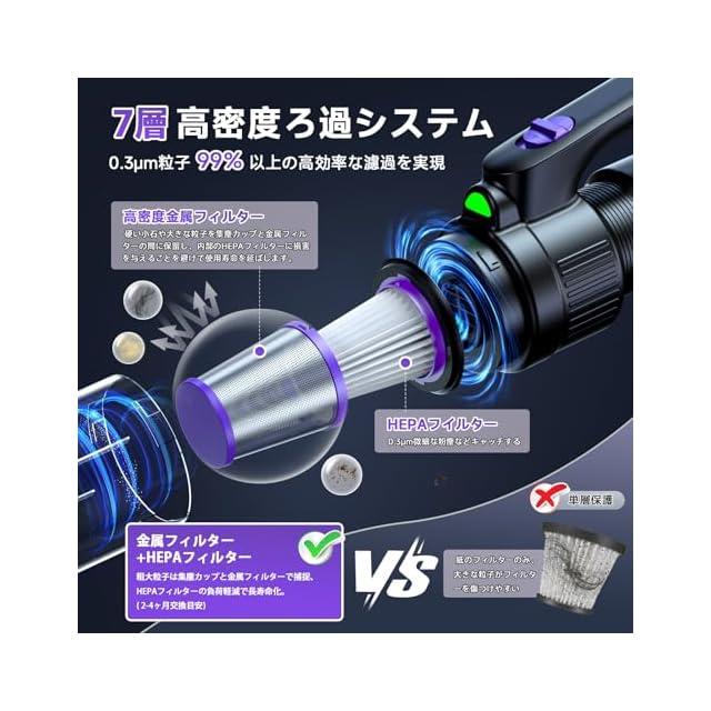 【メタルフィルターとHEPAフィルター*2個】他社製品にないステンレスフィルター+HEPAのダブルフィルター構造で、従来比3段階の浄化性能を実現されます。第一層:ステンレスフィルターで大きなゴミやホコリを事前捕集(HEPAフィルターの目詰まり防止)金属製のため水洗い可能→衛生的でランニングコスト削減、第二層:HEPAフィルターで0.3μmの微小粒子を99.97%捕捉(花粉・PM2.5・アレルギ対策)。× 一般製品:HEPAのみ→大型ゴミで早期目詰まり◉ 当製品:金属メッシュが前処理→HEPA寿命2倍延長(*当社比較試験による)