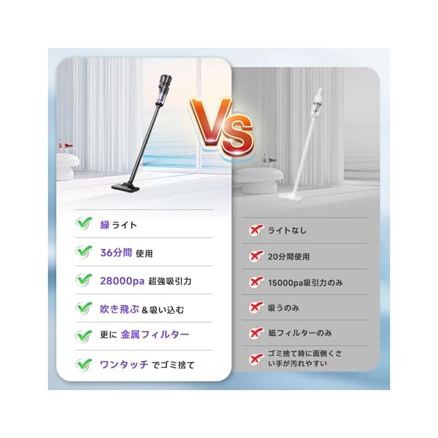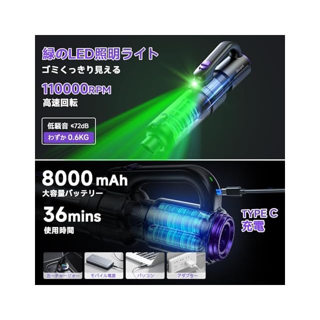 【8000mAh大容量&最大36分連続稼働&Type-C充電】家庭用掃除機は8000mAhの大容量バッテリーが内蔵され、一度の充電で最大36分の連続運転を実現されます。持ち運びもラクで、家中どこでも手軽に使えます。一人用の住まいから、2LDKの部屋も一気にしっかり掃除できます。そして、長くご愛用いただくため、バッテリーには高性能なリチウムイオン電池を採用しました。コードレス掃除機はType-C充電ポートを採用しており、急速充電にも対応。インジケーターライト付きで、充電状態が一目でわかります。充電器は出力5V 2A以上のACアダプターをおすすめします。充電ヘッドはコンピューター、カーチャージャー、アダプター、モバイル電源で便利に充電できます。そして、ほとんどのスマホの携帯用のアダプターと共用できますので、もう「掃除機用のあの充電器」を探す必要はなくなりました。とても便利です!【限定期間キャンペーン】今ご注文いただくと、交換用フィルターセット(3個セット)あるいは掃除機スタンド、掃除機収納バッグがもらえる!(お一人様1回)お気軽に説明書の連絡先より弊社までご応募してください!