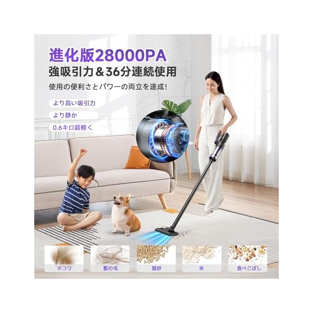 商品名:掃除機 コードレス Bivark 28000pa超強力吸引【2025業界初!吹き飛ぶ/吸い込む/空気入れ&超軽量】36分連続稼働 0.6kg Type-C充電式 スティック掃除機 6WAY LEDライト付 低騒音 布団用ブラシ付 浮き輪やエアマットなど対応 HEPA多重濾過ハンディースティッククリーナー ワンタッチゴミ捨て 省エネ一人暮らし&お年寄り3年 敬老の日 年末お掃除