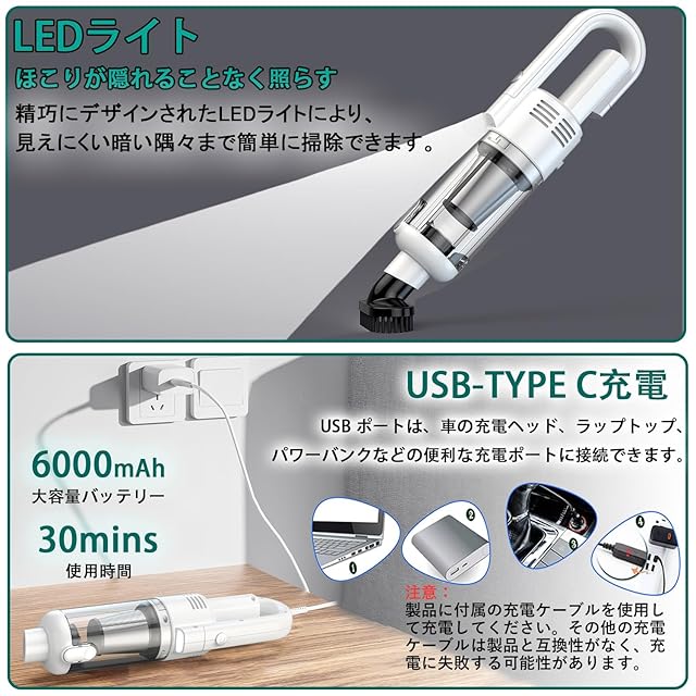 【USB-Type C充電式6000mAh大容量で26分間連続使用】最大6000mAhの大容量バッテリーを内蔵し、フル充電で26分間の連続使用時間を実現。 独戸住宅でも独棟でも、どこでも強力な清掃サービスを提供できます。 電池不足を気にせず掃除作業を楽にします。