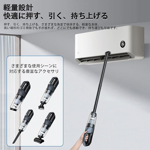 【ワイヤレス設計、軽量】このクリーニング製品はワイヤレス設計を採用し、軽量なので、電源がない場所でも自由に使えます。 ほうきのように手に持つこともでき、掃除機で簡単に掃除できます。 握る位置を自由に変え、必要な場所に簡単に掃除でき、快適で便利です。 特に超軽量800gなので、女性や高齢者の方も簡単に掃除でき、腕や肩の不快感を心配する必要がありません。