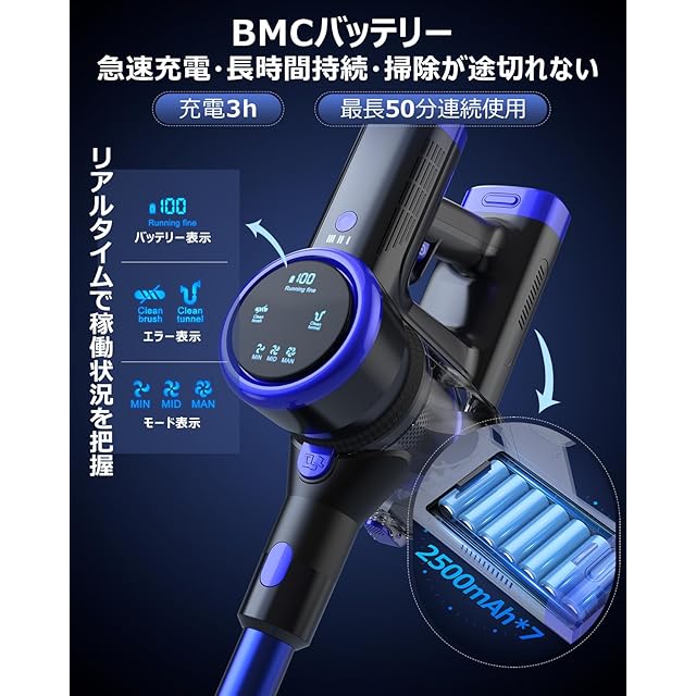 【スマート操作で清掃を可視化】デジタルディスプレイ搭載のこの掃除機は、バッテリー残量と吸引力レベルを常に確認可能。3段階(20/40/50kPa)の切替えで、フローリングからカーペットまで、あらゆる床材に最適なモードを選択できます。機械式ボタンを採用している手元を見ずに確実な操作が可能。さらに高輝度LEDライト内蔵で、暗い部屋の隅や家具の下の細かいゴミも見逃さないです。