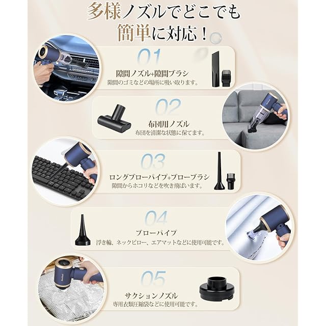 【新登場!十分な吸引力】 ✅吹き飛ぶ✅ 吸い込む ✅空気入れ ✅空気抜き。BeeToolのハンディクリーナーはミニ掃除機/エアダスター/電動エアーポンプとして利用可能です。ソファの隙間、キーボード、車内掃除、ネックピロー、エアベッド、エアボート、専用衣類圧縮袋などの場所に使用可能です。7種の交換用アタッチメントを備えて異なる用途に使えて、車内/自宅兼用のハンディクリーナーです。
