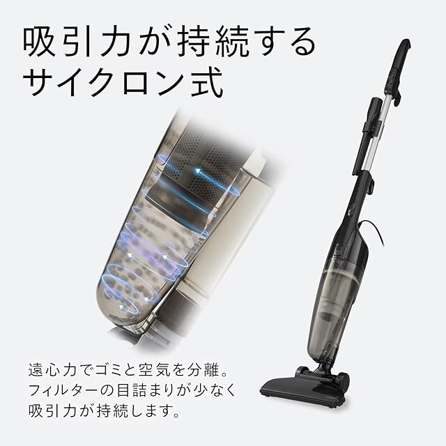 【サイクロン式だから吸引力が持続】遠心力でゴミと空気を分離。フィルターの目詰まりが少なく吸引力が持続します。アウターフィルターと布フィルターの2層構造で微細なゴミやほこりをしっかり取り除きます。