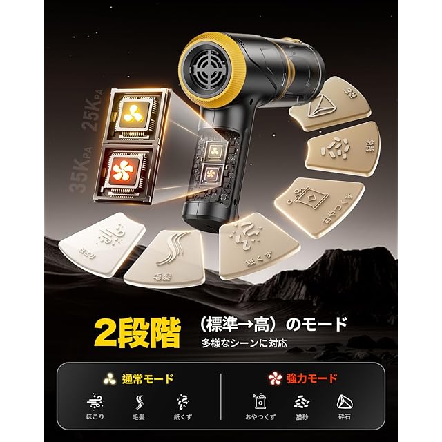 【業界トップ35000Pa&次世代ブラシレスモーター】 高効率ブラシレスモーターを搭載し、従来のモーター比で消費電力30%削減&耐久性2倍を実現します。2段階調節可能(ロー:25000Pa / ハイ:35000Pa)で、車内の砂粒からカーペットに食い込んだペットの毛まで対応して、髪の毛、隅のホコリ、食べ物の残りかす、タバコの吸い殻、足の汚れ、猫砂などを一気に取り除きます。ハイパワー運転時でも振動を最大67%低減する独自制御技術を搭載して、騒音テストで65dB以下を達成します。