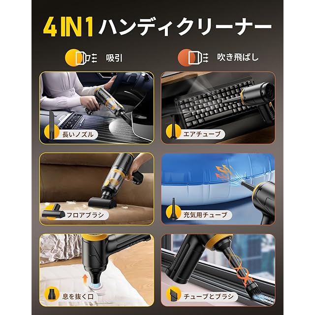 【多機能4-in-1車内&自宅兼用】✅吹き飛ぶ✅ 吸い込む ✅空気入れ ✅空気抜き&交換可能なノズルが付属しています。コンパクトで軽量なので、車内に置いてもホコリやゴミを効果的に掃除できます。ご家庭では、ソファ、マットレス、窓、キーボードのコーナーなどのホコリやゴミを効果的に掃除できて、シーンに応じて7種類のアタッチメントも付属してしており、コードレスで設置場所・掃除場所にかかわらず使いやすい、ハンディクリーナーの理想といえる製品です。