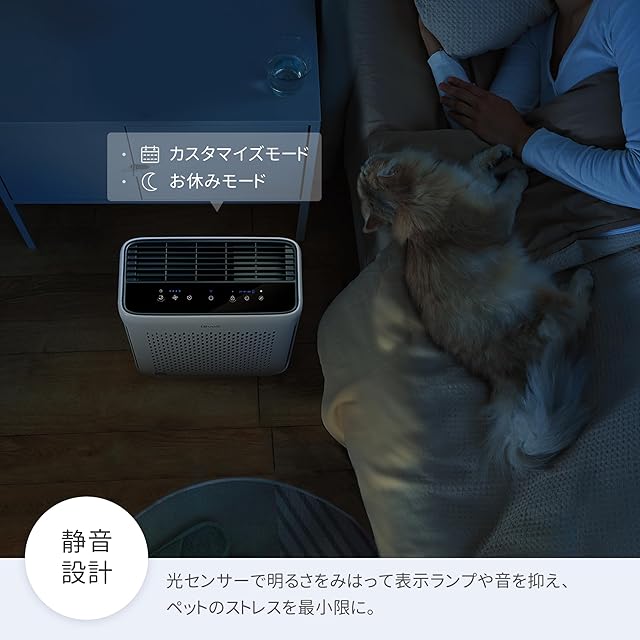 【光センサーとカスタマイズできるお休みモードで、快適な睡眠空間を実現するコンパクトモデル】①スマホで光検出機能をオンにすると、部屋の明るさに応じて表示部の明るさを自動調整します。空気を効率的に浄化しながら、光が邪魔にならないです。②独自開発の静音技術でお休みモードの運転音を23dBに低減しました。更に、スマホからおやすみモードを自分流にカスタムできます。いつも快適な睡眠空間を作ります。③シンプルでスタイリッシュなデザインとコンパクトなサイズで場所も取らず、あらゆるタイプの部屋に置いても馴染みます。