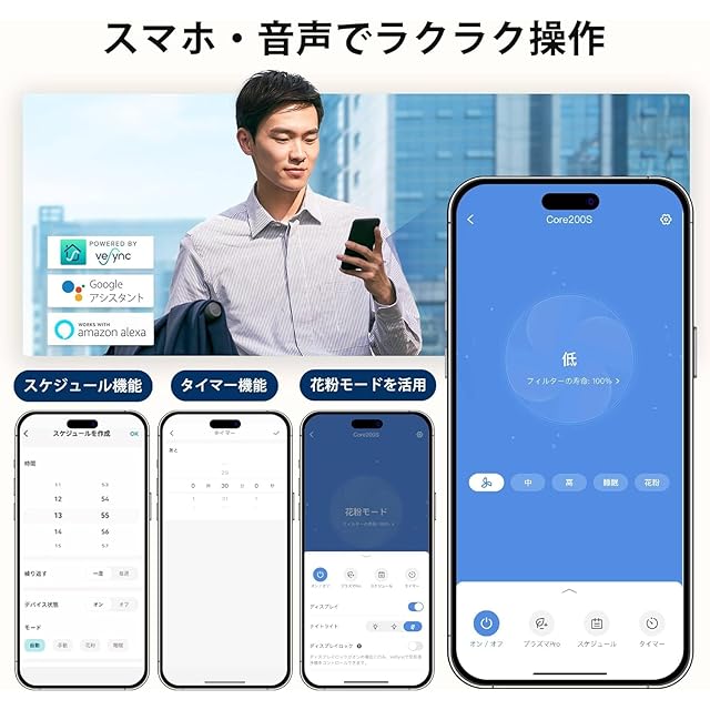 【スマート型、花粉モードも搭載】①スマホとスマートスピーカーとの連携で、スケジュール機能に加え、いつでもどこでも空気清浄機を操作できます。②また、花粉モードもアプリに搭載されており、強と弱モードの20分ごとに繰り返す運転で、浮遊と付着花粉や埃を効率的に取り除きます。