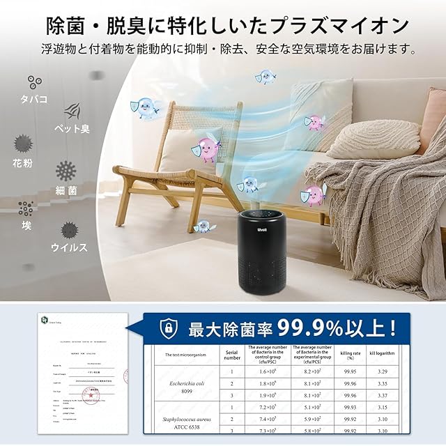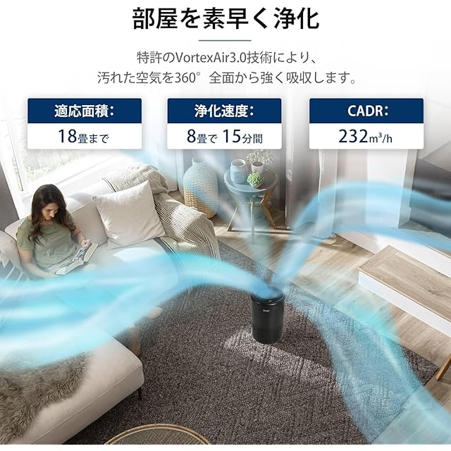 【コンパクトで強力、18畳まで対応】①特許のVortexAir3.0技術により、コンパクトなボディーで強力の浄化能力を実現しました。360°全面から強く吸収し、8畳の部屋をわずか15分で浄化し、18畳まで対応できます。②より良い浄化効果を達するために、最大で部屋の広さの2〜3倍の面積に対応できる空気清浄機を選ぶのが最善であるとオススメしています。