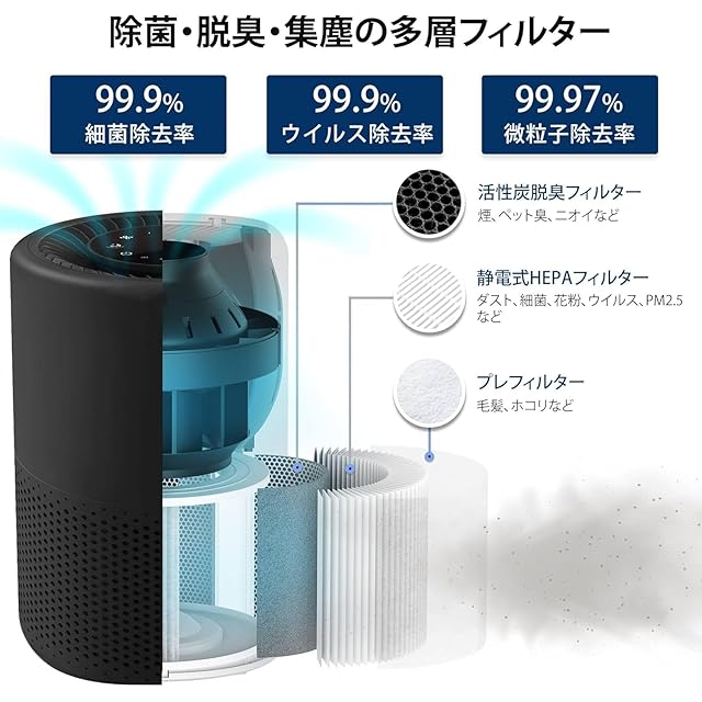 【プラズマイオンとフィルター2in1清浄】①プラズマイオンはファン式の風が行き届かない場所の汚れた空気も死角なく浄化し、浮遊も付着した汚れも効果的に除去します。②また、H13静電HEPAフィルターは、ウイルス・PM2.5など0.1μmまでの微細粒子を99.97 %以上除去します。③消臭専用の活性炭フィルターは、タバコ臭、トイレ臭、ペット臭など、気になるニオイをしっかり分解します。④プレフィルターは髪の毛や繊維、ホコリなどの大きなゴミを捕え、フィルターの寿命を伸ばします。