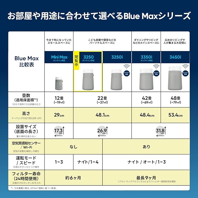✅【Blue Max】ブルーエア独自の空気清浄技術HEPASilentテクノロジーを搭載。本体下部で360°から空気を吸い込み、0.1μmまでの有害物質を99.97%除去*2します。人が集まる大空間に対応するBlue Max 3450i、LDKなど暮らしのメインスペースに最適なBlue Max 3350i、こども部屋や寝室などのパーソナルスペースに最適なBlue Max 3250i/3250と広さに合わせて選べる3サイズを展開。