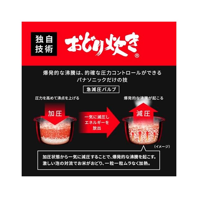 独自の圧力技術「おどり炊き」 でふっくら甘みのあるごはんに 急減圧で爆発的な沸騰を引き起こすから、お米がおどり、一粒一粒に熱が伝わる