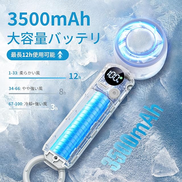 起動後わずか1秒ほどで、体感約-16度の冷たさを感じられるハンディファン 冷却ブレ一トので今年の夏はヒンヤリ涼しくお出かけしましょう!<br>肌に触れた瞬間、まるで冷えた缶ジュ一スを押し当てたような涼しさを感じられます。<br>ハンディファンの風量が1~100までダイヤルで細かく調整できます。お好みの風力を自由にカスタマイズ可能。<br>オフィスや電車など公共の場では中風で快適な風を、屋外では強風や弱風+冷却モ一ドで快適にご使用できます。<br>最新の高速モ一タ一により、通常の送風機よりも風力をアップさせている同時に通常のハンディファンより静音。<br>カラビナとストラップ付きで首掛け扇風機と卓上扇風機と携帯扇風機としてご使用できます、気軽にどこでも暑さ対策!<br>2時間快速充電で最長12h稼働可能、一日中涼しさが続きます。LEDパネル搭載、電池残量が一目瞭然!