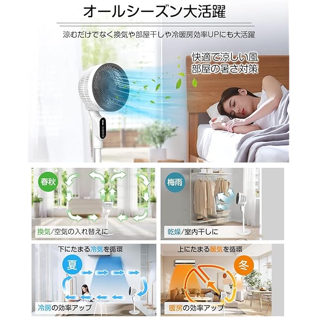 商品名:扇風機 サーキュレーター 兼用【2025モデル・首振り・節電対策】1台多役 リビング扇風機 省エネ 風量6段階 パワフル送風 大風量 60秒パネル自動消灯 リモコン付き 換気扇 タイマー付き 高さ調節可能 1.8M電源コード 24畳 お手入れ簡単 オールシーズン活躍 冷房/暖房 空気循環 換気 梅雨 衣類乾燥 せんぷうき PSE認証済み 日本語取扱説明書付き (ホワイト)