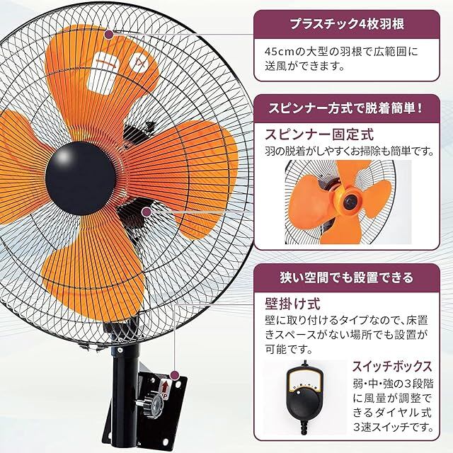 商品名:【.co.jp限定】ナカトミ 45cm 業務用扇風機(工業扇) 壁掛け型 スピンナー式(羽根簡単取付) 3段階風量 左右首振 上下首折 壁掛け扇 工業 扇風機 QZW-45