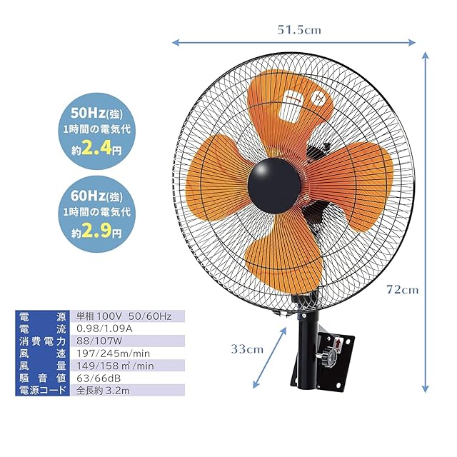 電源:単相100V 50/60Hz、消費電力(強):88/107W 電流(強):0.98/1.09A