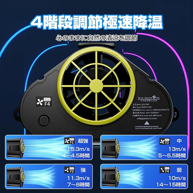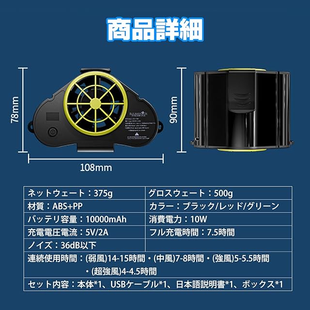 最長15時間連続使用可能:10000mAh大容量バッテリにより、ファンの長時間の動作を確保し、頻繁に充電する必要がなく、日常的に使用するのに便利です。取り外し可能な出入風口設計があり、水洗い可能です