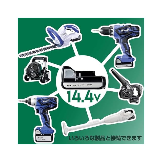 対応蓄電池(別売り):リチウムイオン電池BSL36A18、BSL36B18(HiKOKIブランドのみ)、BSL1860、BSL1850、BSL1840、BSL1830、BSL1830C、BSL1825、BSL1460、BSL1450、BSL1440、BSL1430、BSL1430C、BSL1425、BSL1420、BSL1415、BSL1415S