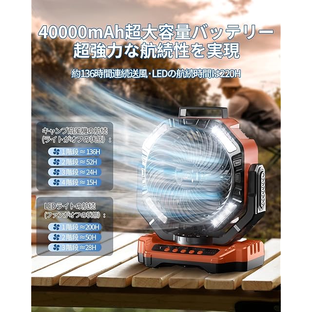 商品名:キャンプ 扇風機 充電式扇風機 40000mAh大容量 最大136時間連続使用 風量4段階調節 DCモーター 静音 Type-C充電式 吊り下げ タイマー機能 自動首振り リモコン付き 32枚高輝度LEDライト搭載 小型 バッテリー 扇風機 卓上扇風機 アウトドア 扇風機 防災 キャンプ用品 業務用 工業扇 車中泊 コンパクト 持ち運び便利