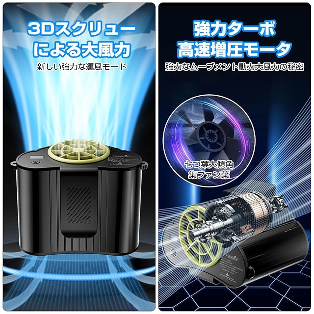 3D超強風:8W出力15000回転高速強力モータモーと7葉高回転ターボファンを搭載し、ジェットファンターボ過給技術をシミュレーションし、ダクト設計を最適化し、気流を利用して負圧状態で吸気道から広範囲の空気を吸い込み、集風ダクト圧縮後に加速噴霧して15m/sの強力な大風を発生させた
