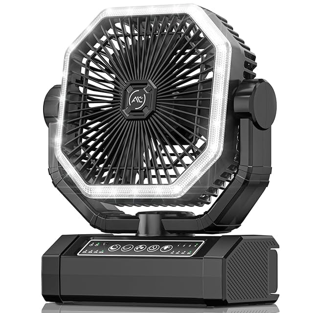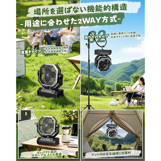 【マルチ機能・ LEDライトモード】調光可能なLED照明システムを内蔵したキャンプ扇風機。360°回転する隠しフックで卓上/吊り下げの両方の設置方法に対応。室内用としてもアウトドア用のキャンプ扇風機としても便利にご利用いただけます。扇風機 吊り下げはフックの底に収納され、開いて木の上やテントの上や横に掛けることができ、異なる高さで涼しさと明るさをもたらす。
