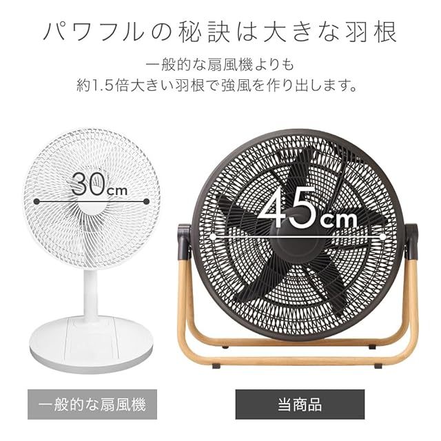パワフルの秘訣は直径45cmの大型5枚羽根。一般的な扇風機よりも一気に広範囲へ風を送り出せるため、広い空間でもしっかり風が届きます。