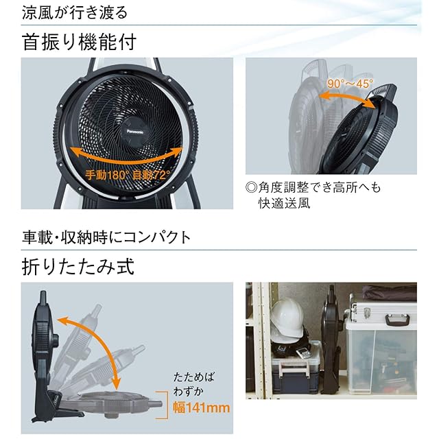 商品名:パナソニック(Panasonic) 充電扇風機 工事用 ACアダプタ付き(電池・充電器別売) デュアル (14.4V/18V/AC100V対応) 薄型 折りたたみ時141mm 自動首振り72° ポータブル コードレスファン 工場扇 工業扇風 サーキュレーター 換気 ブラック EZ37A4-B ブラック