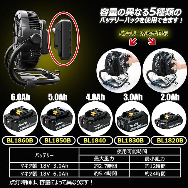 【風量無段階調整&明るさ調節3段階】風量はダイヤル調整式で、使用シーンやお好みに合わせて風量調節が可能です。最大風速5.5m/S、最小風速3.0m/S。連続使用時間:最大風量時約2.7H 最小風量時約12H(※18V 3Aバッテリー使用時)。明るさ調節3段階、HIGH・MID・LOWモードあり、シーンに応じて光量調節が可能です。